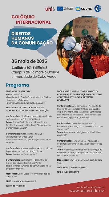 A Comissão Nacional para os Direitos Humanos e a Cidadania e a Universidade de Cabo Verde promoveram, no dia 5 de maio de 2025, um Colóquio Internacional intitulado "Direitos Humanos da Comunicação". O evento, que decorreu num dos auditórios da UNICV, na cidade da Praia, contou com a participação de diversos especialistas nacionais e internacionais. que abordaram temas diversos.