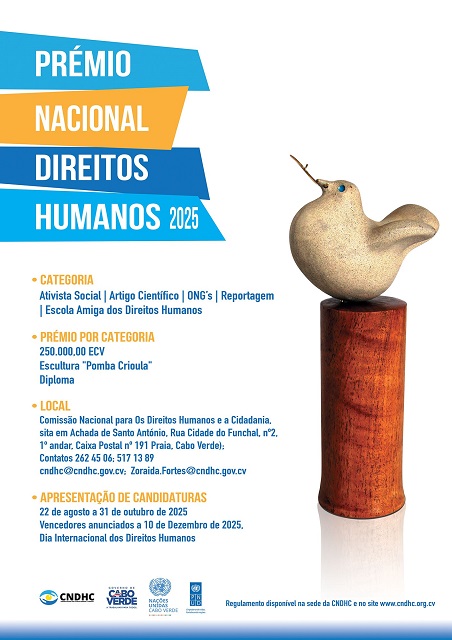 A Comissão Nacional para os Direitos Humanos e a Cidadania (CNDHC) lança o Concurso para atribuição do “Prémio Nacional Direitos Humanos 2025”. O prémio destaca pessoas, estudos, ou instituições que, com as suas ações, conduta ou atividade têm contribuído para a promoção, reflexão e defesa dos Direitos Humanos e da Cidadania em Cabo Verde.