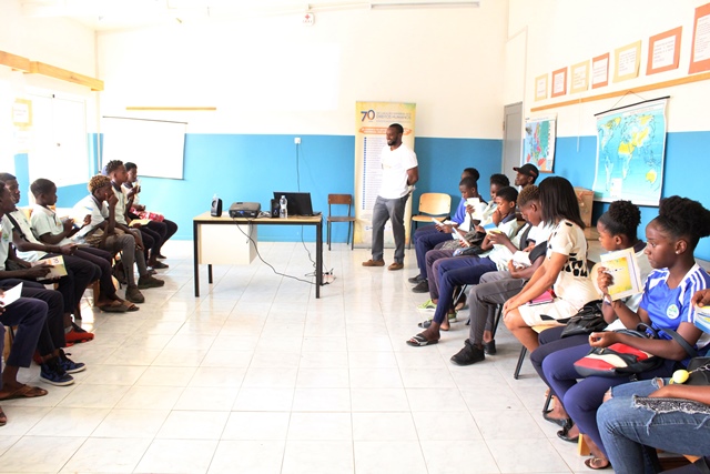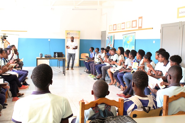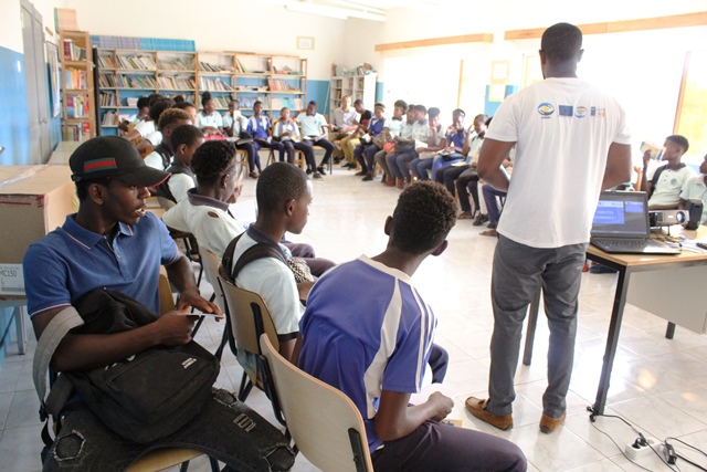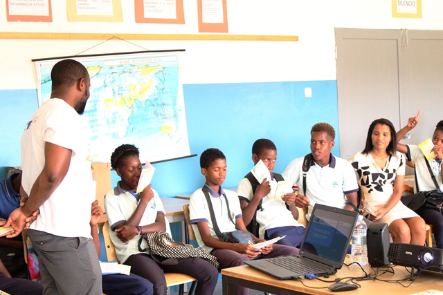Ailton Silva e Marísia Nascimento, Técnicos da Comissão Nacional para os Direitos Humanos e a Cidadania, dirigiram a sessão da campanha na Escola Secundária Constantino Semedo, na Cidade da Praia, Santiago.